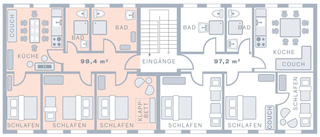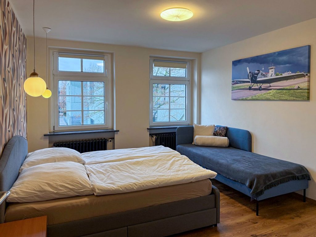 Die Ferienwohnung Hugo mit ihren 100 m2 ist eine helle Wohnung und bietet Platz für 8 Personen (3 Schlafzimmer).